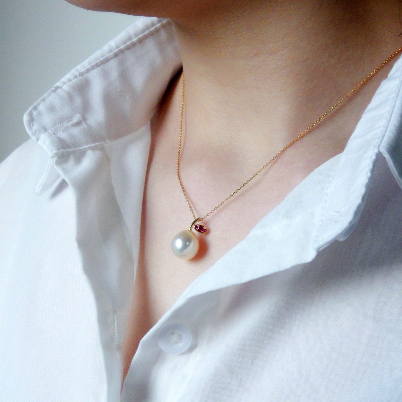 K18YG 南洋白蝶真珠・ルビーペンダントトップ《Fruit》