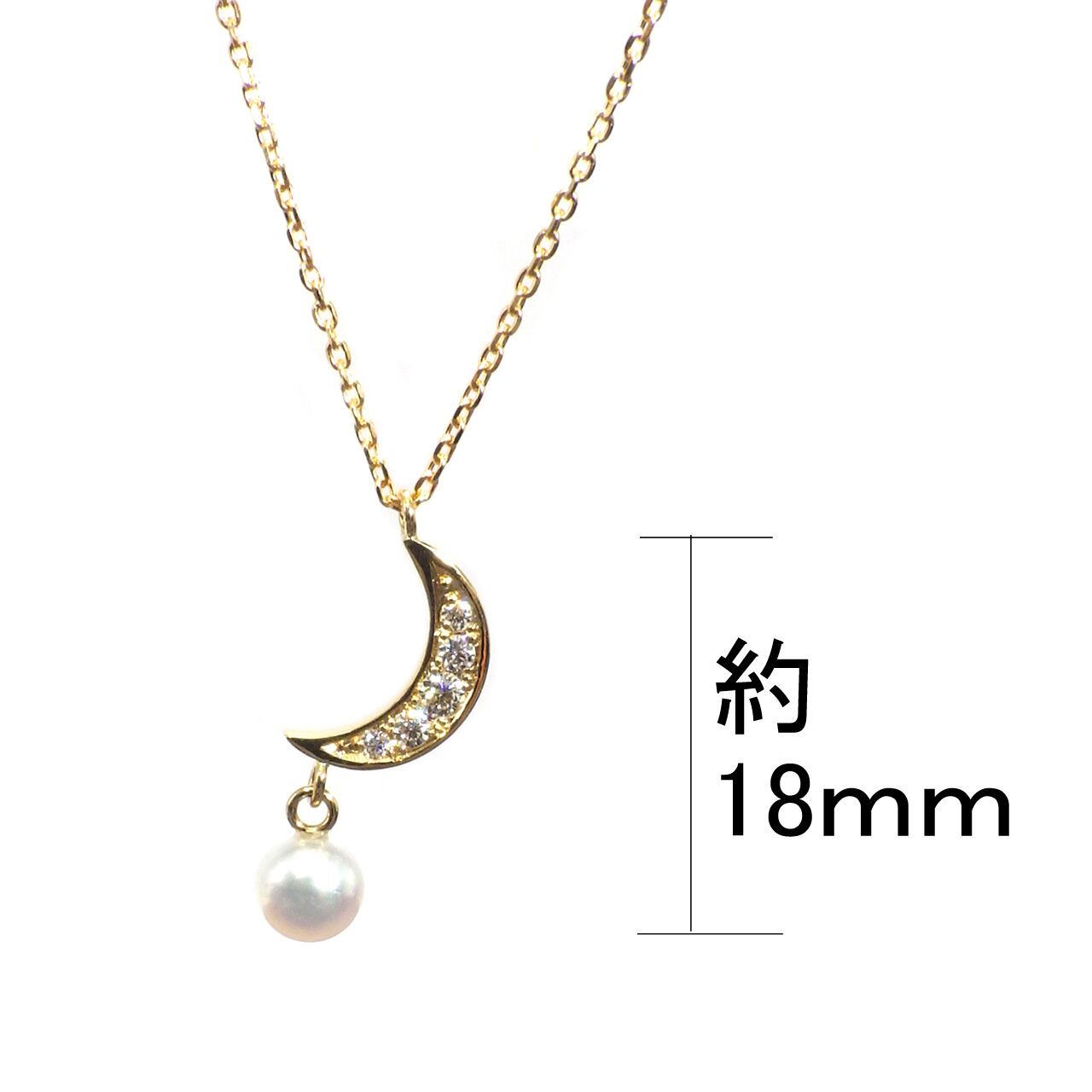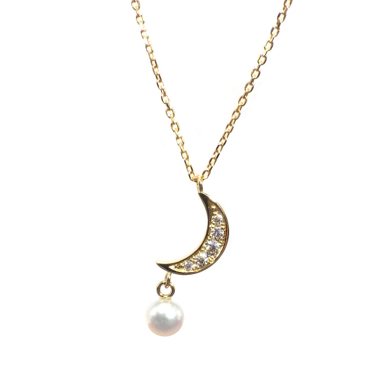 イエローゴールドの三日月に、ハート&キューピッドの現れる優れたカットグレードのメレダイヤをていねいにセッティング。