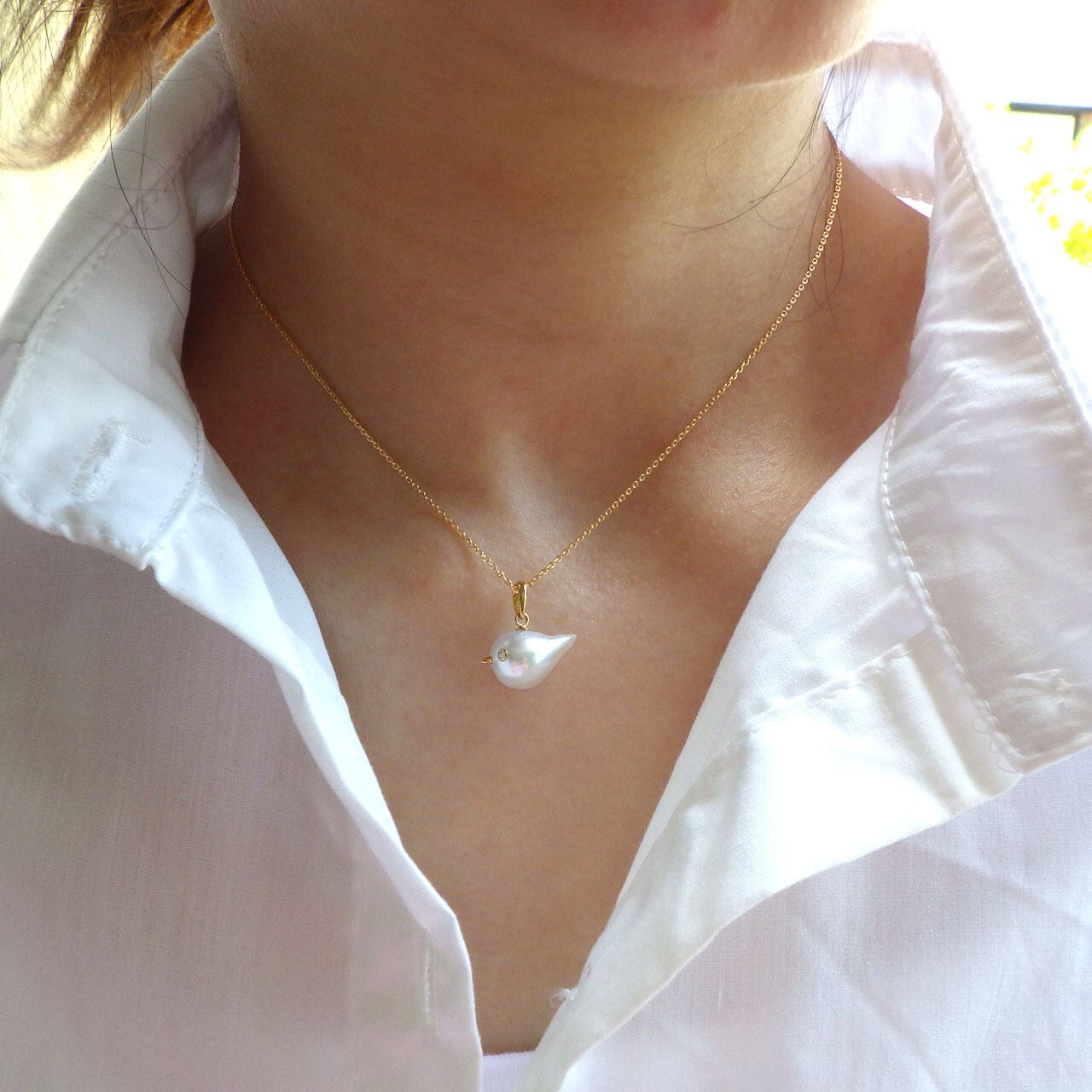 バロックパールの自然なフォルムに、ダイヤモンドの瞳と、イエローゴールドの小さなくちばしをつけたら、かわいい小鳥になりました。