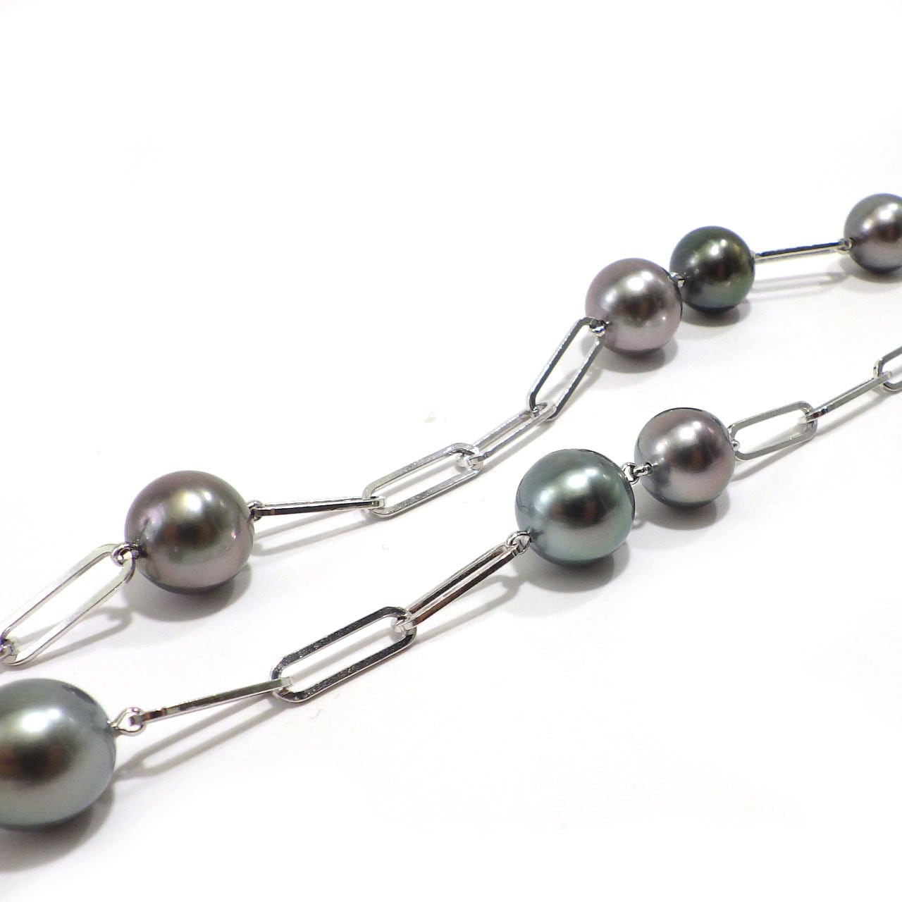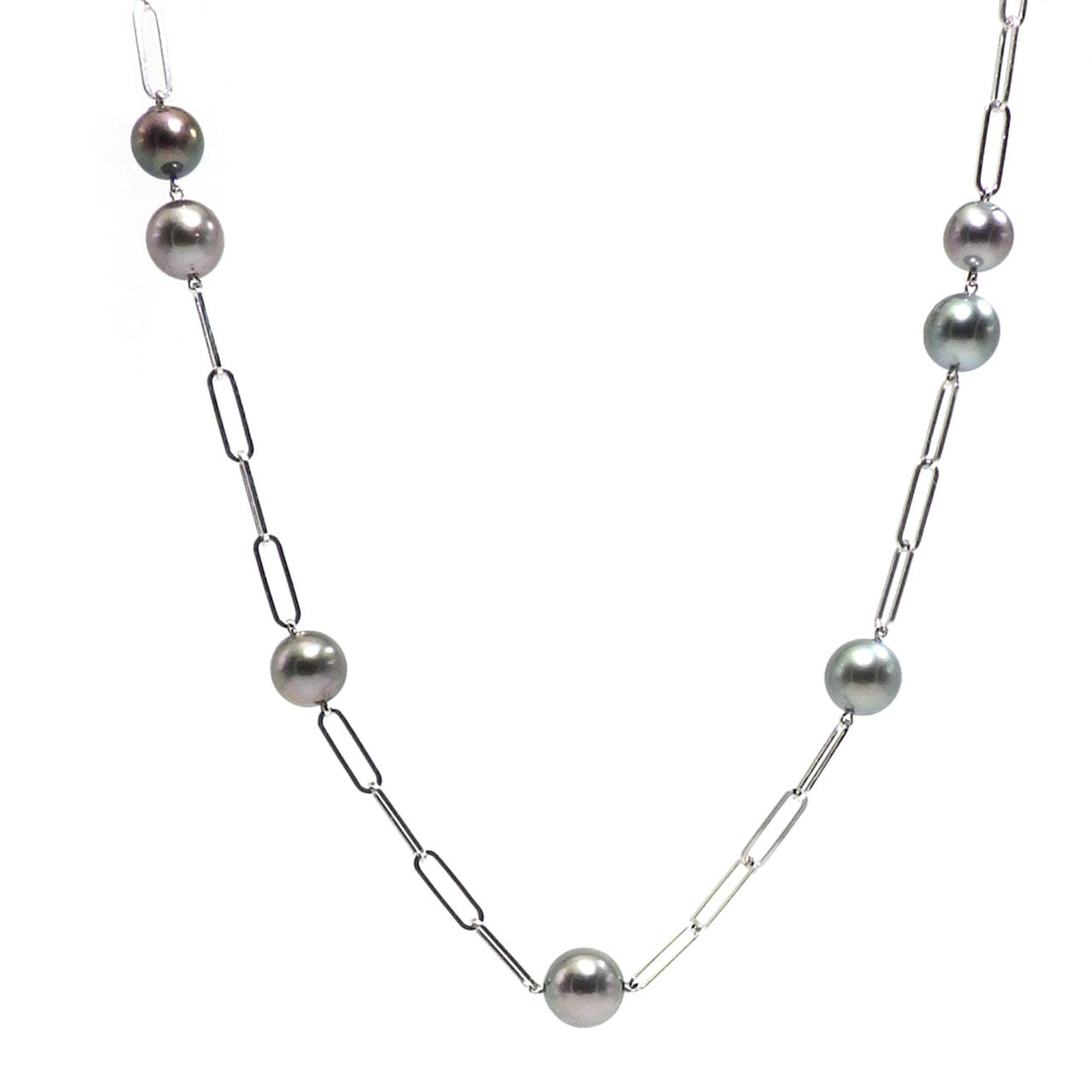 美しいカラーの黒蝶真珠を、ランダムに連ねたステーションネックレス。